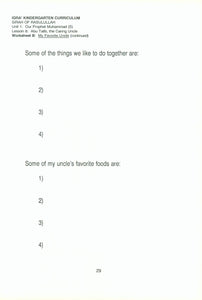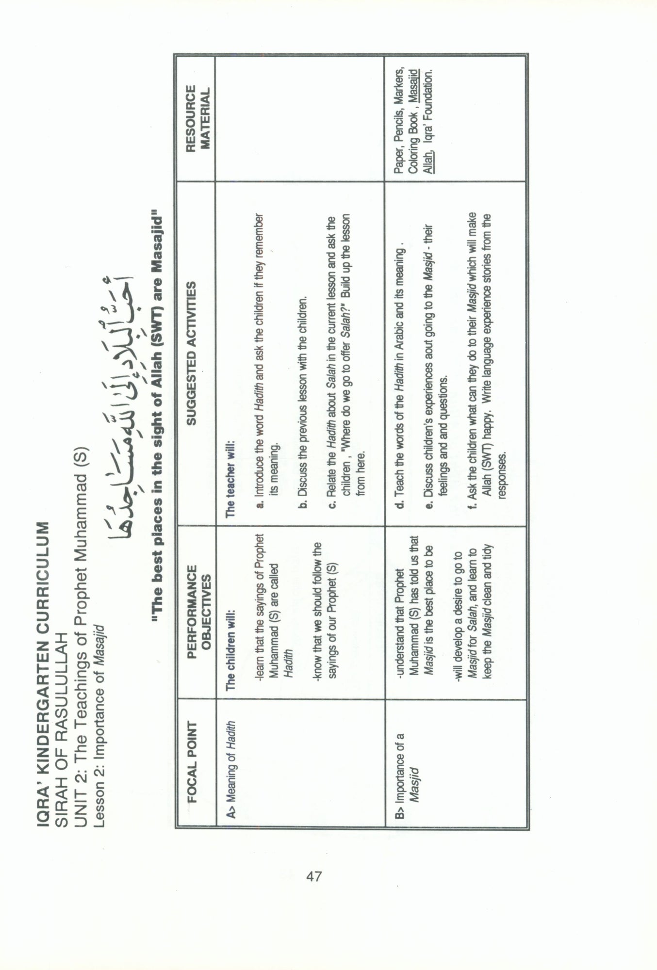 The objective of the program is to develop the Islamic development of a child through the integration of Islamic values and nurturing Islamic behavior. The author has put emphasis on the acquisition and development of Islamic behavior among school-aged children (6-8 years), keeping in mind their social, cognitive, motor, physical and emotional developmental stage of school-aged children. In the upper elementary levels, the author has extended the objectives to include the study and critical understanding of the various fields of Islamic behavior and etiquette for school-aged children who can learn and adopt new behavior easily and quickly from those they idealize.
