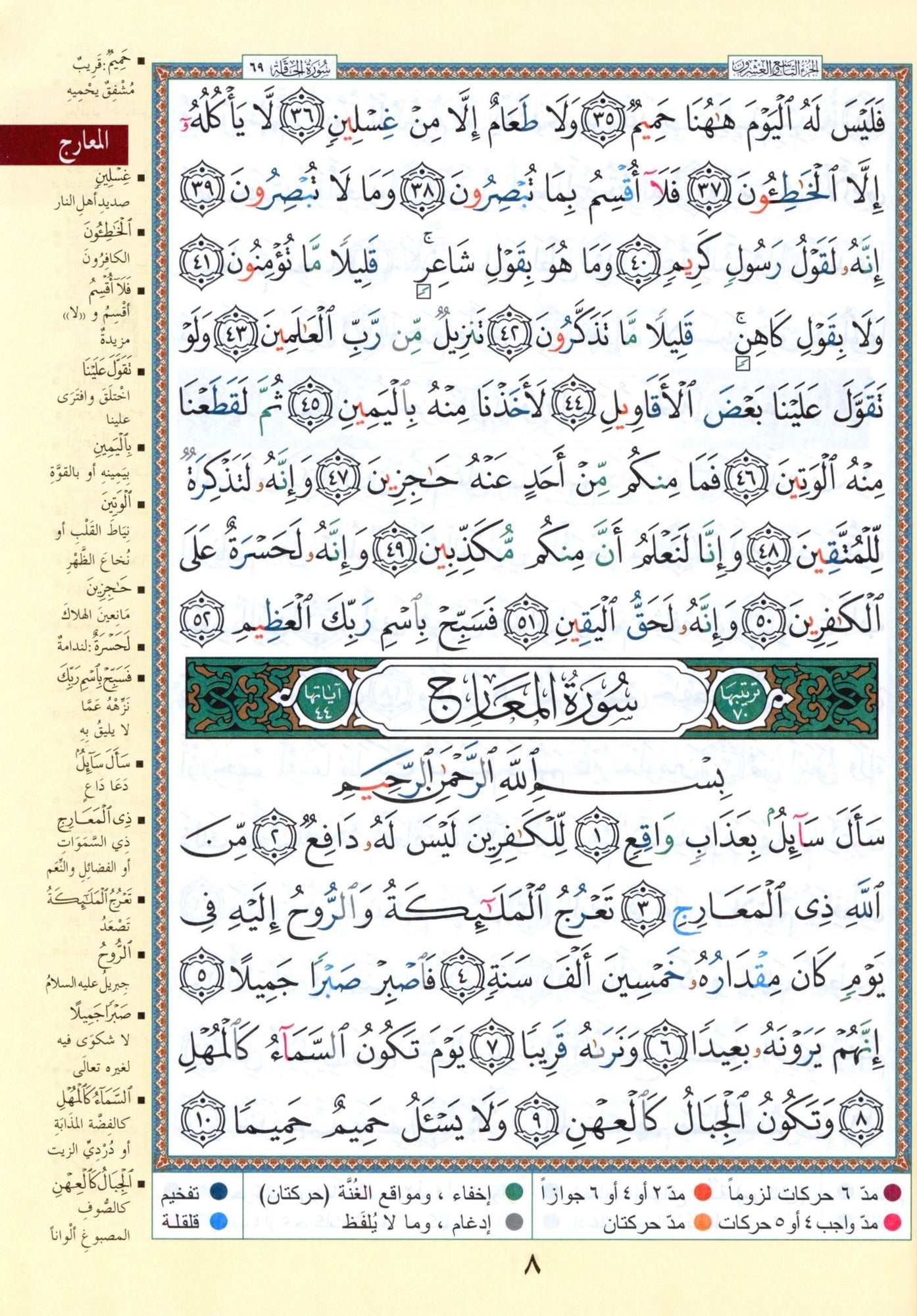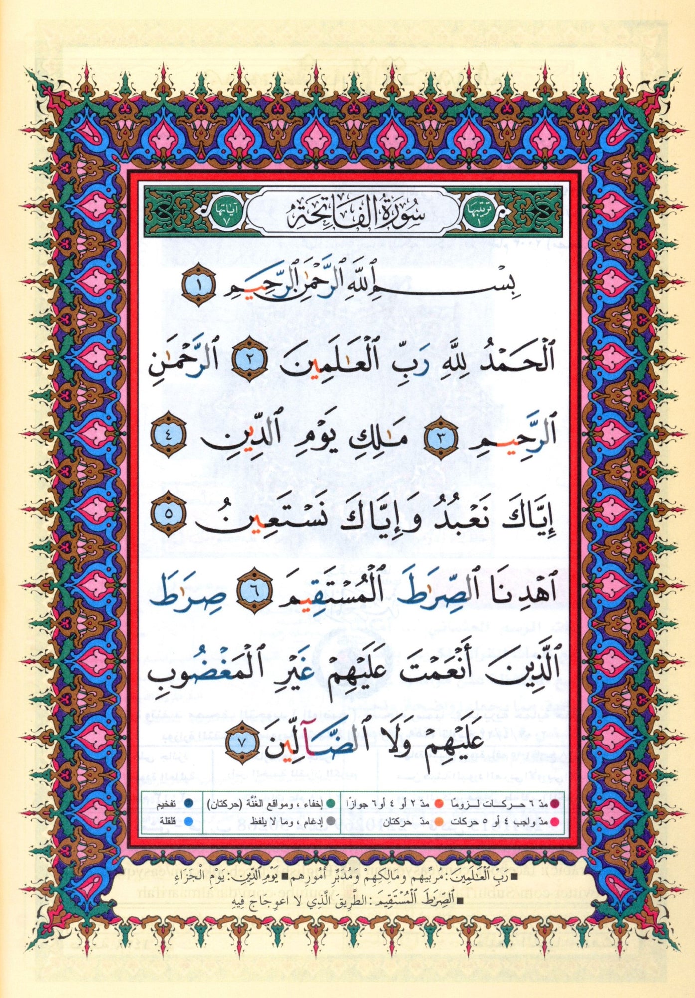 The text has been created by the publishers to demonstrate the tajweed norms when reading the Qur'an. The writing style of the book is Uthmani, with case vowelization and dotting on the audible characters. The use of color to distinguish between letters pertaining to different tajweed rules inside the text indicates those rules. This method aids in encouraging and facilitating accurate Qur'anic recitation by making the rules of recitation easier for the reader to understand. The text is color-coded: blue denotes a strong pronunciation of the letter, green indicates nasalization, red indicates characters that require expanded vocalization, and grey indicates when a letter is not uttered.
