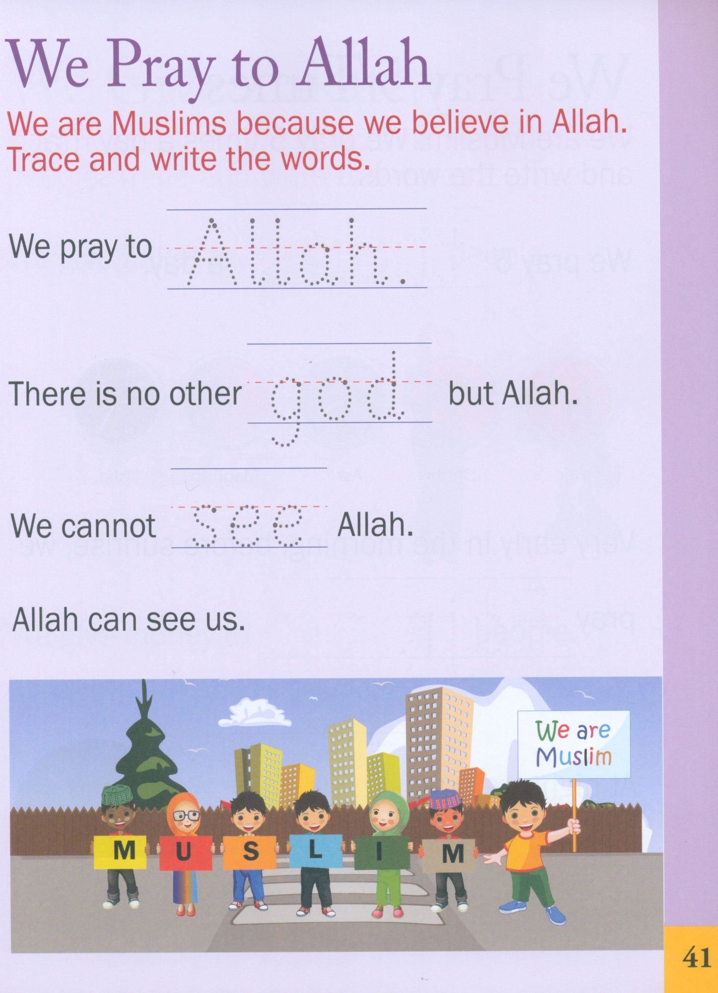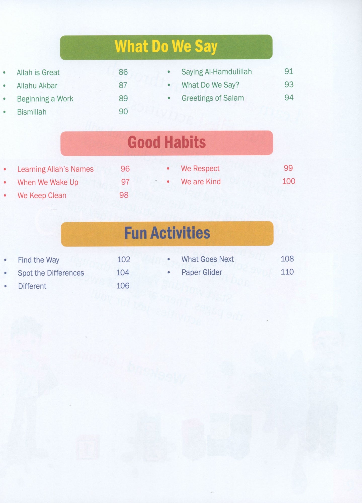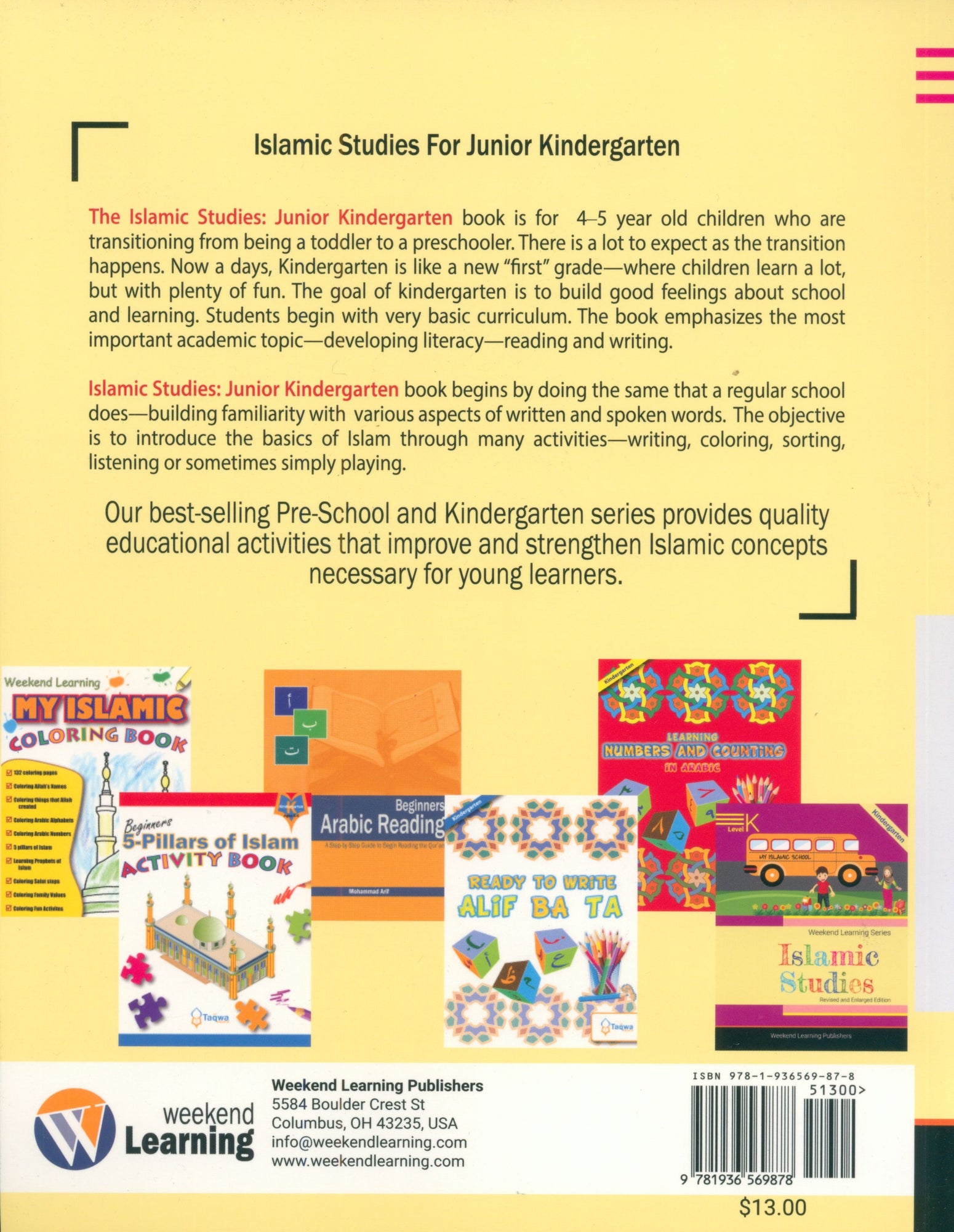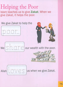 The Islamic Studies Junior Kindergarten book is intended for children ages 4–5—who are transitioning from being a toddler to a preschooler. There is a lot to expect as the transition happens. At this tender age, children learn a lot but also learn through fun activities. The goal of Junior Kindergarten is to encourage and build good feelings about school and learning. Students begin with a very basic curriculum. The book emphasizes the most important academic activity—developing literacy through reading and writing.