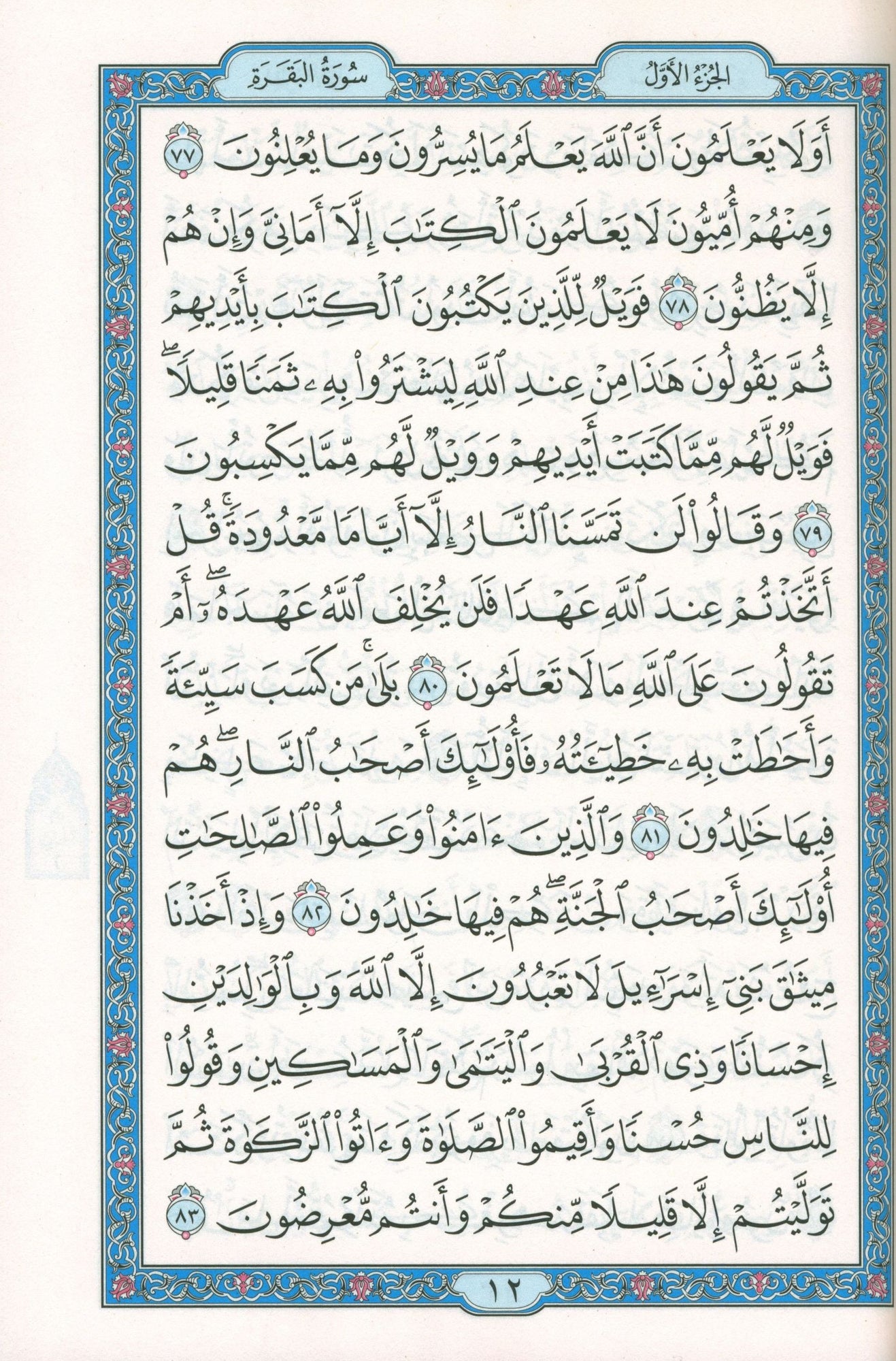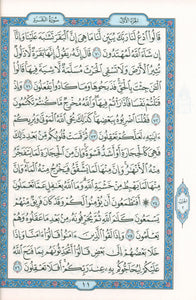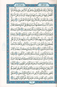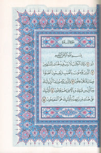 Here is the Qur'an in 611 pages of beautiful, large-print Arabic script by Uthman Taha. From the title page to the list of Suras the divine words are surrounded by symbols in the margins and printed within tinted text boxes that feature intricate borders. Each appearance of the name of God is distinguished by red font. This handsome hardcover edition is a remarkable addition to any Arabic-speaking Muslim's personal library, and makes a fine item for collectors or scholars of religious texts or foreign languages.