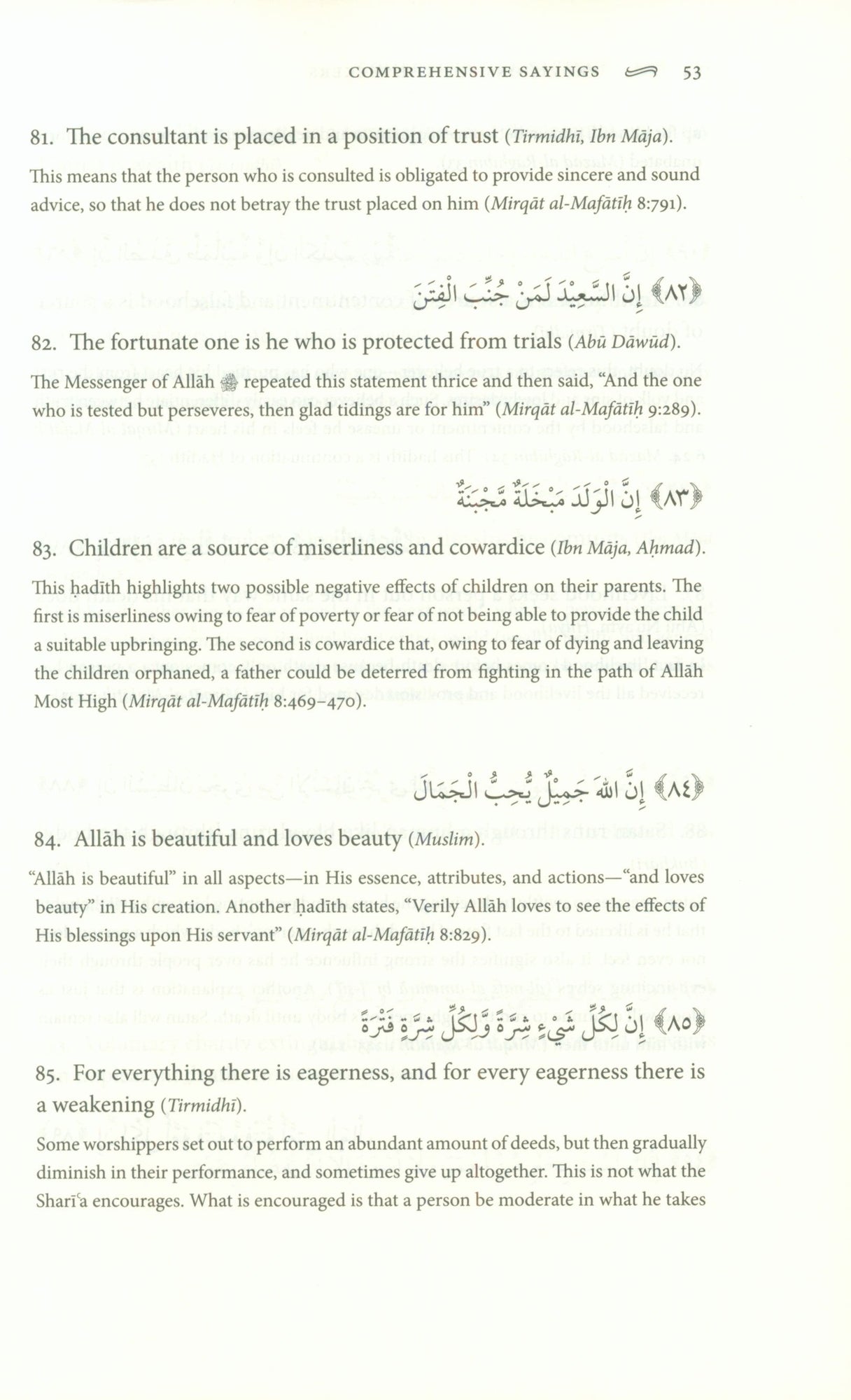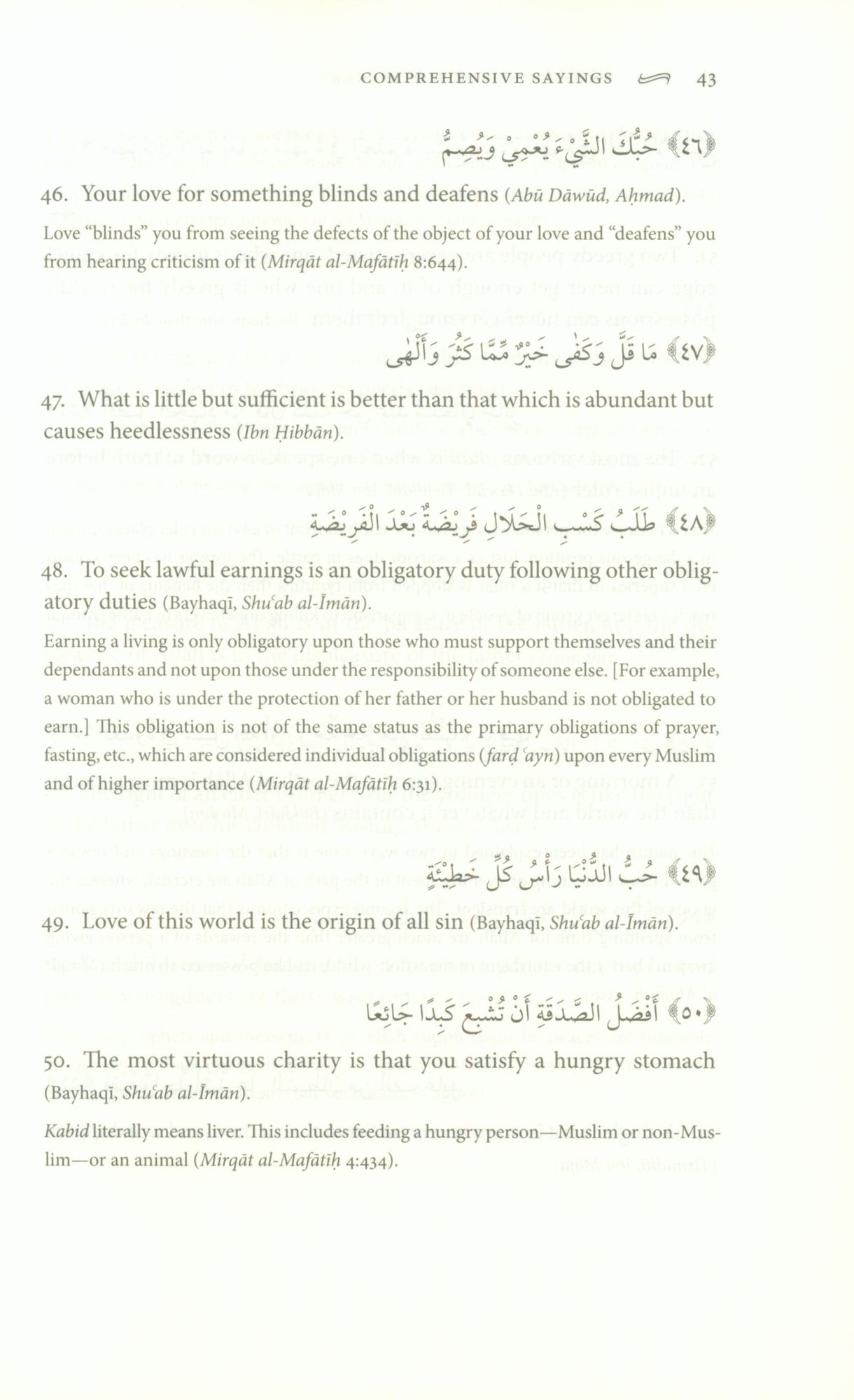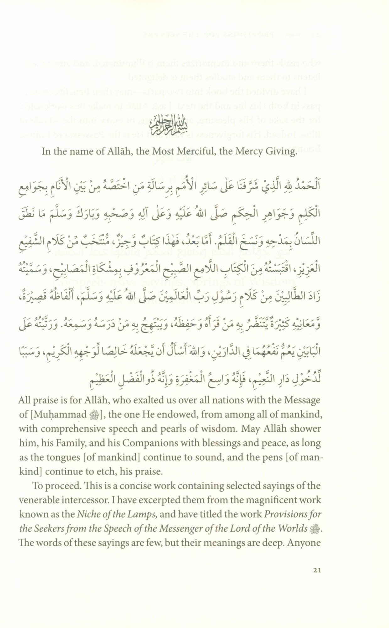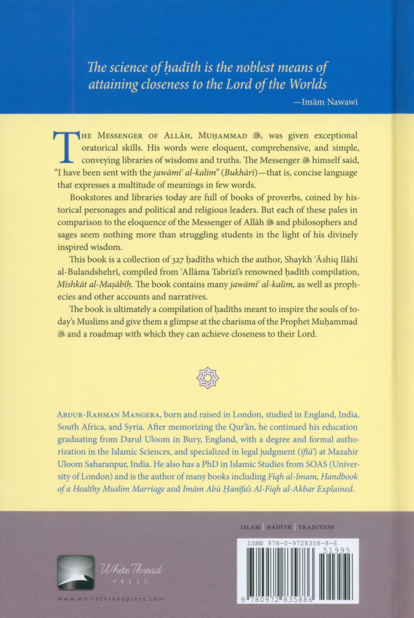 Imam Nawawi wrote: The science of hadith is the noblest means of attaining closeness to the Lord of the Worlds Muhammad, the Messenger of God (upon him be peace) was given exceptional oratorical skills. His words were eloquent, comprehensive, and simple, conveying libraries of wisdoms and truths. The Messenger (upon him be peace) himself said, I have been sent with the jawami al-kalim (Bukhari) that is, pithy language that expresses a multitude of meanings in few words. Bookstores and libraries today are full of books of proverbs, coined by historical personages and political and religious leaders. But each of these pales in comparison to the eloquence of the Messenger of God (upon him be peace) and philosophers and sages seem nothing more than struggling students in the light of his divinely inspired wisdom. This book is a collection of 327 hadiths which the author, Shaykh 'Ashiq Ilahi al-Bulandshehri, compiled from 'Allama Tabrizi s renowned hadith compilation, Mishkat al-Masabih. The book contains many jawami' al-kalim, as well as prophecies and other accounts and narratives. The book is ultimately a compilation of hadiths meant to inspire the souls of today s Muslims and give them a glimpse at the charisma of the Prophet Muhammad (upon him be peace) and a roadmap with which they can achieve closeness to their Lord. This work is taught in many of the madrasas around the world as a first hadith work. Now it is available in this beautifully bound English edition with a commentary from the classical sources.